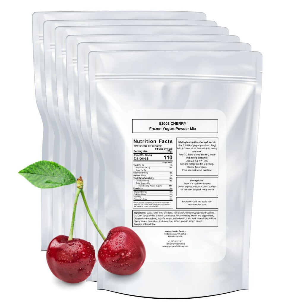 Cherry frozen yogurt mix 2kg/4.4lb Bag. Six bags per box. Each bag is 23 x 33 x 10cm/9 x 13 x 4 inches. Yield is over 10 liters/2.64 gallons of final frozen product per bag of powder.