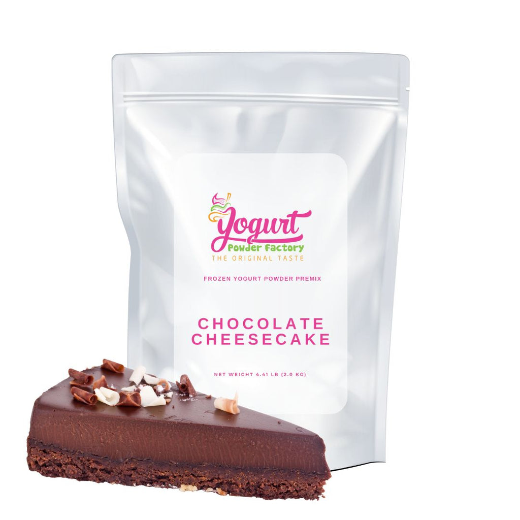Chocolate Cheesecake Pre Mix frozen yogurt flavor 2kg/4.4lb Bag. Six bags per box. Each bag is 23 x 33 x 10cm/9 x 13 x 4 inches. Yield is over 10 liters/2.64 gallons of final frozen product per bag of powder.