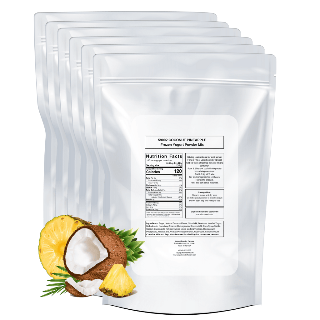 Coconut Pineapple frozen yogurt mix 2kg/4.4lb Bag. Six bags per box. Each bag is 23 x 33 x 10cm/9 x 13 x 4 inches. Yield is over 10 liters/2.64 gallons of final frozen product per bag of powder.