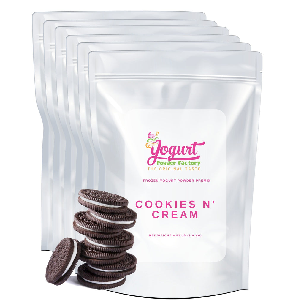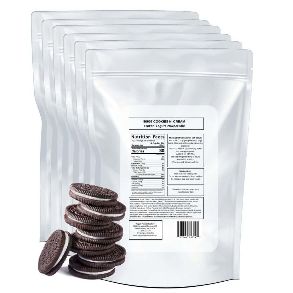 Cookies n' Cream frozen yogurt mix 2kg/4.4lb Bag. Six bags per box. Each bag is 23 x 33 x 10cm/9 x 13 x 4 inches. Yield is over 10 liters/2.64 gallons of final frozen product per bag of powder.