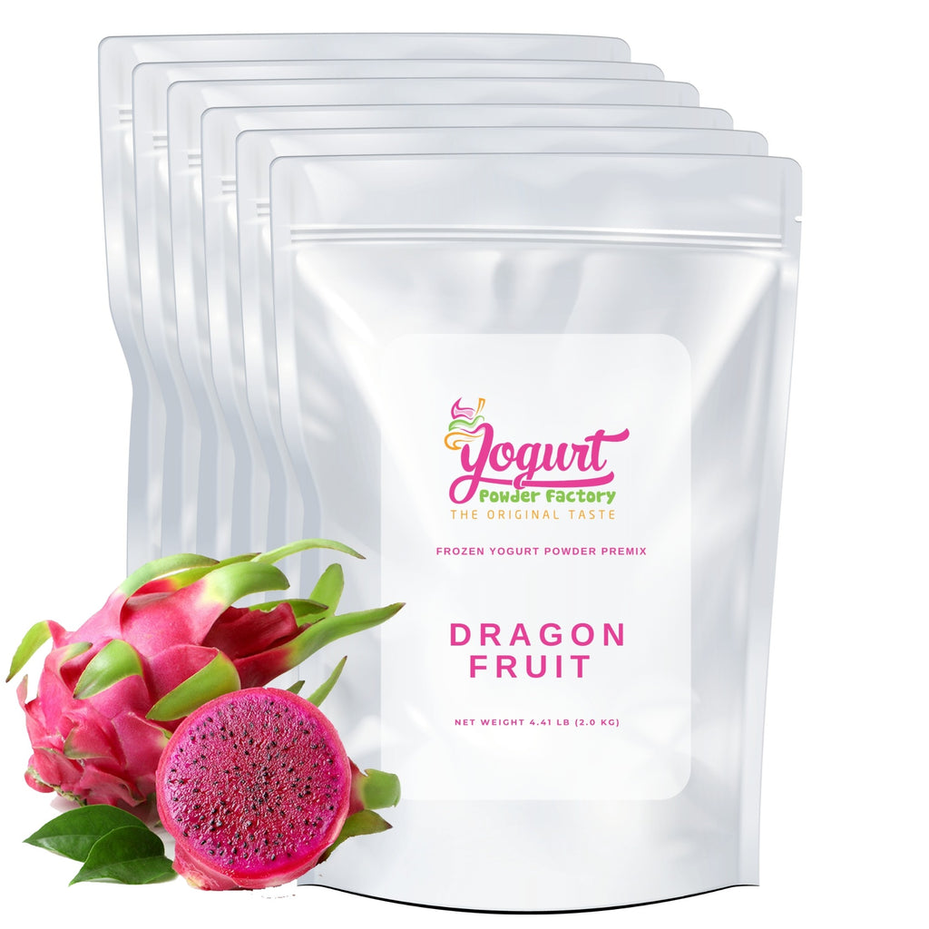 Dragon Fruit frozen yogurt mix 2kg/4.4lb Bag. Six bags per box. Each bag is 23 x 33 x 10cm/9 x 13 x 4 inches. Yield is over 10 liters/2.64 gallons of final frozen product per bag of powder.