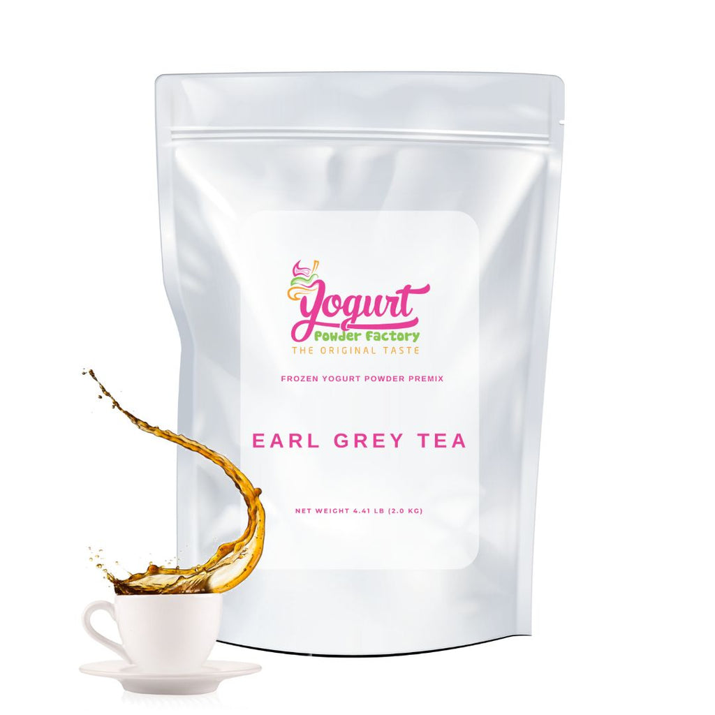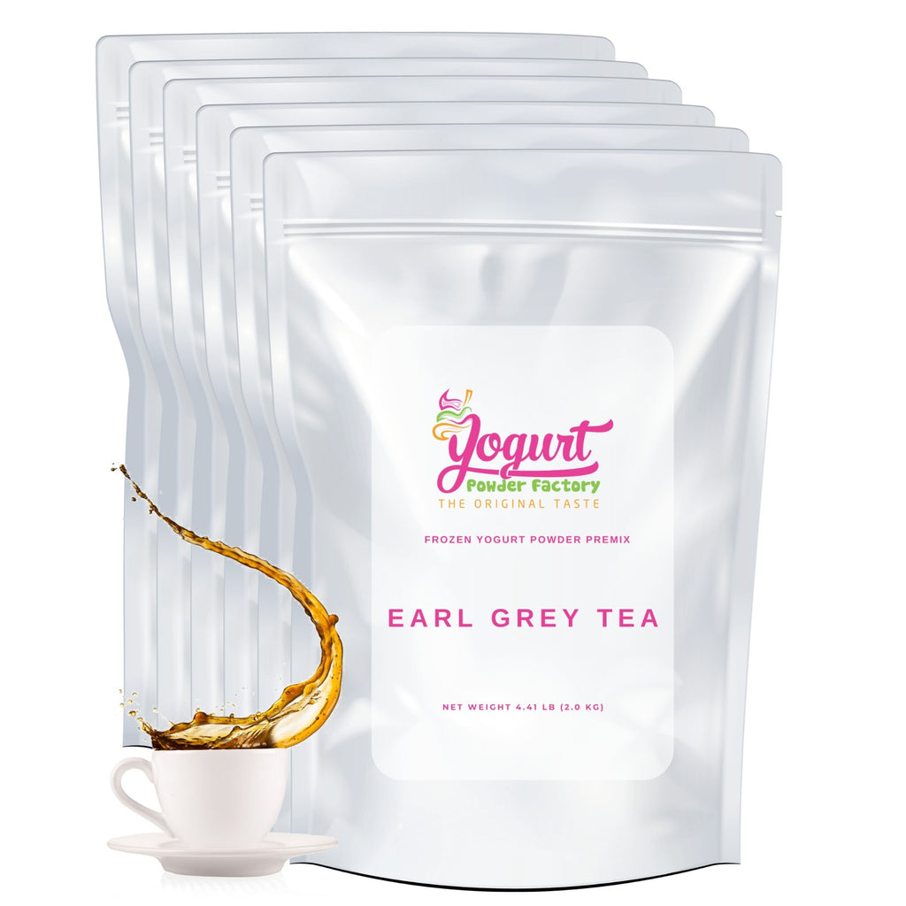 Earl Grey frozen yogurt flavor Pre Mix 2kg/4.4lb Bag. Six bags per box. Each bag is 23 x 33 x 10cm/9 x 13 x 4 inches. Yield is over 10 liters/2.64 gallons of final frozen product per bag of powder.