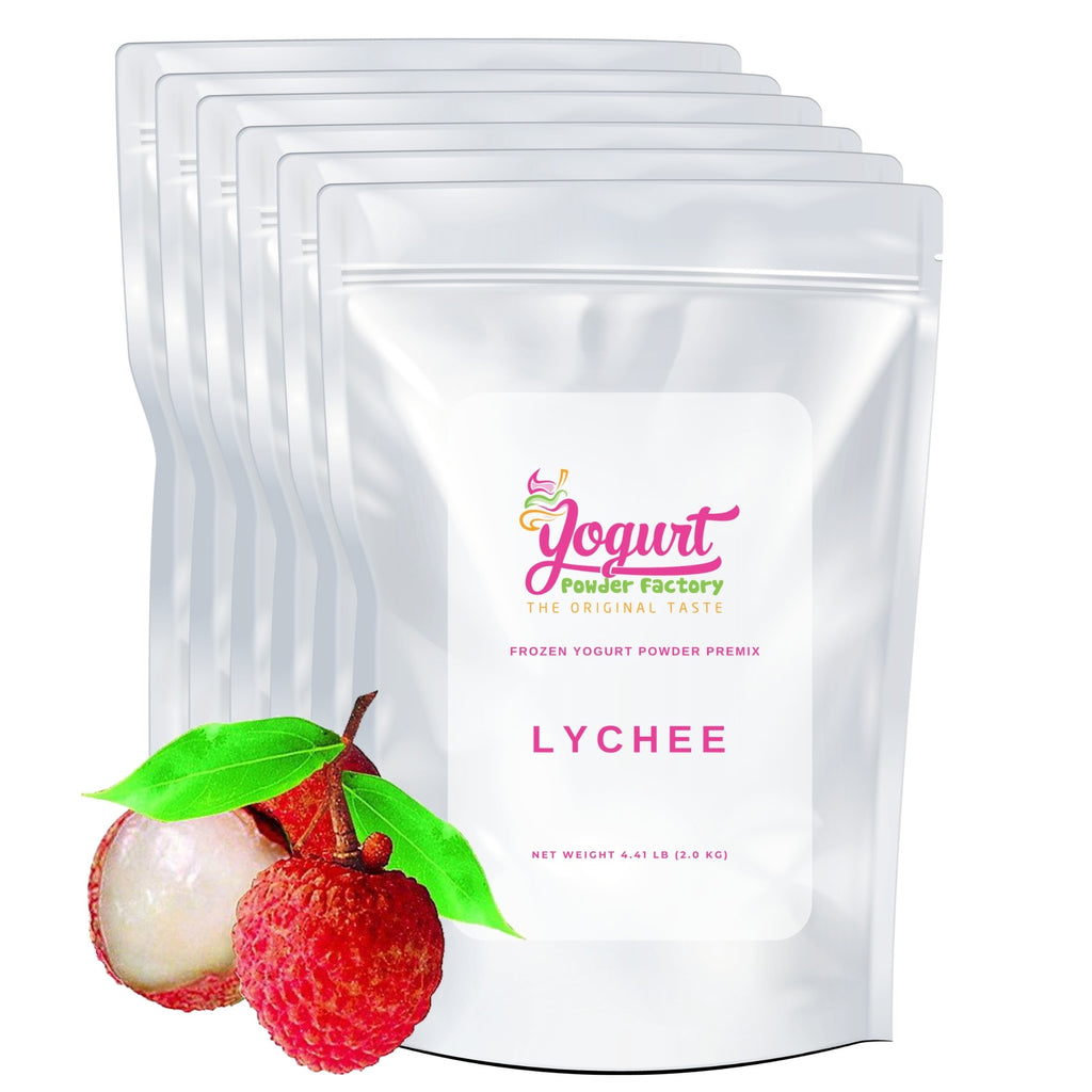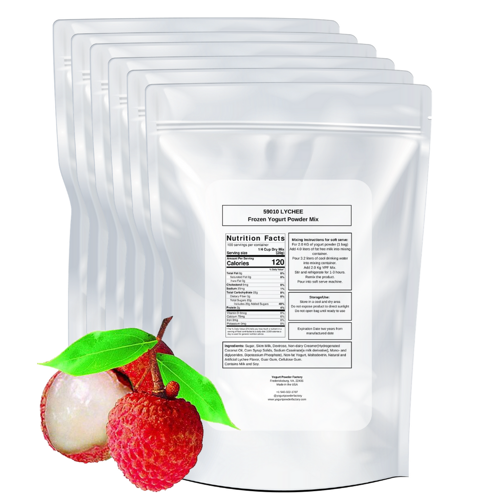Lychee flavor frozen yogurt mix 2kg/4.4lb Bag. Six bags per box. Each bag is 23 x 33 x 10cm/9 x 13 x 4 inches. Yield is over 10 liters/2.64 gallons of final frozen product per bag of powder.