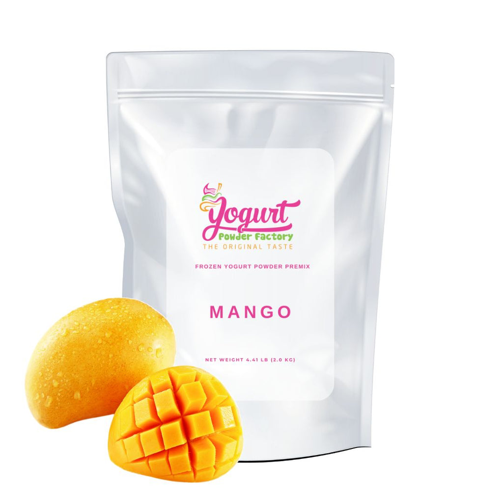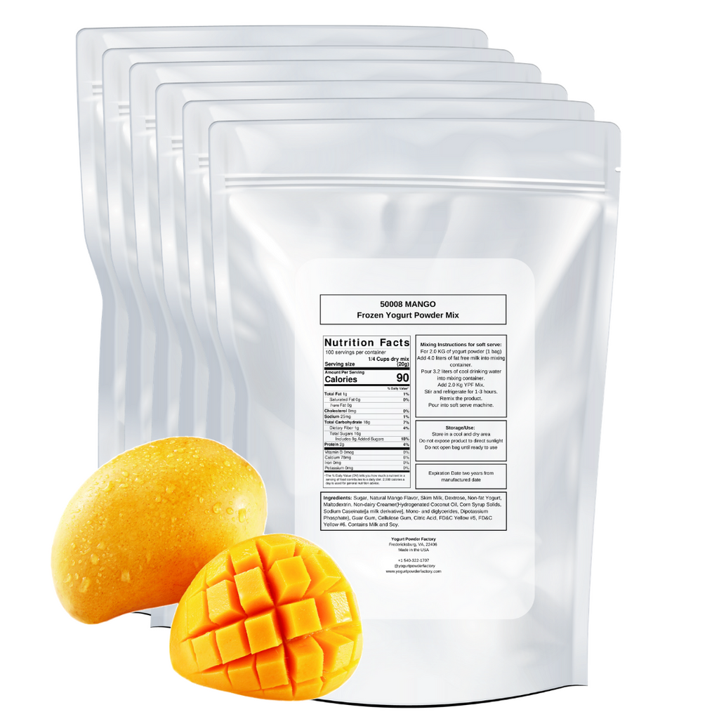 Mango frozen yogurt mix 2kg/4.4lb Bag. Six bags per box. Each bag is 23 x 33 x 10cm/9 x 13 x 4 inches. Yield is over 10 liters/2.64 gallons of final frozen product per bag of powder.