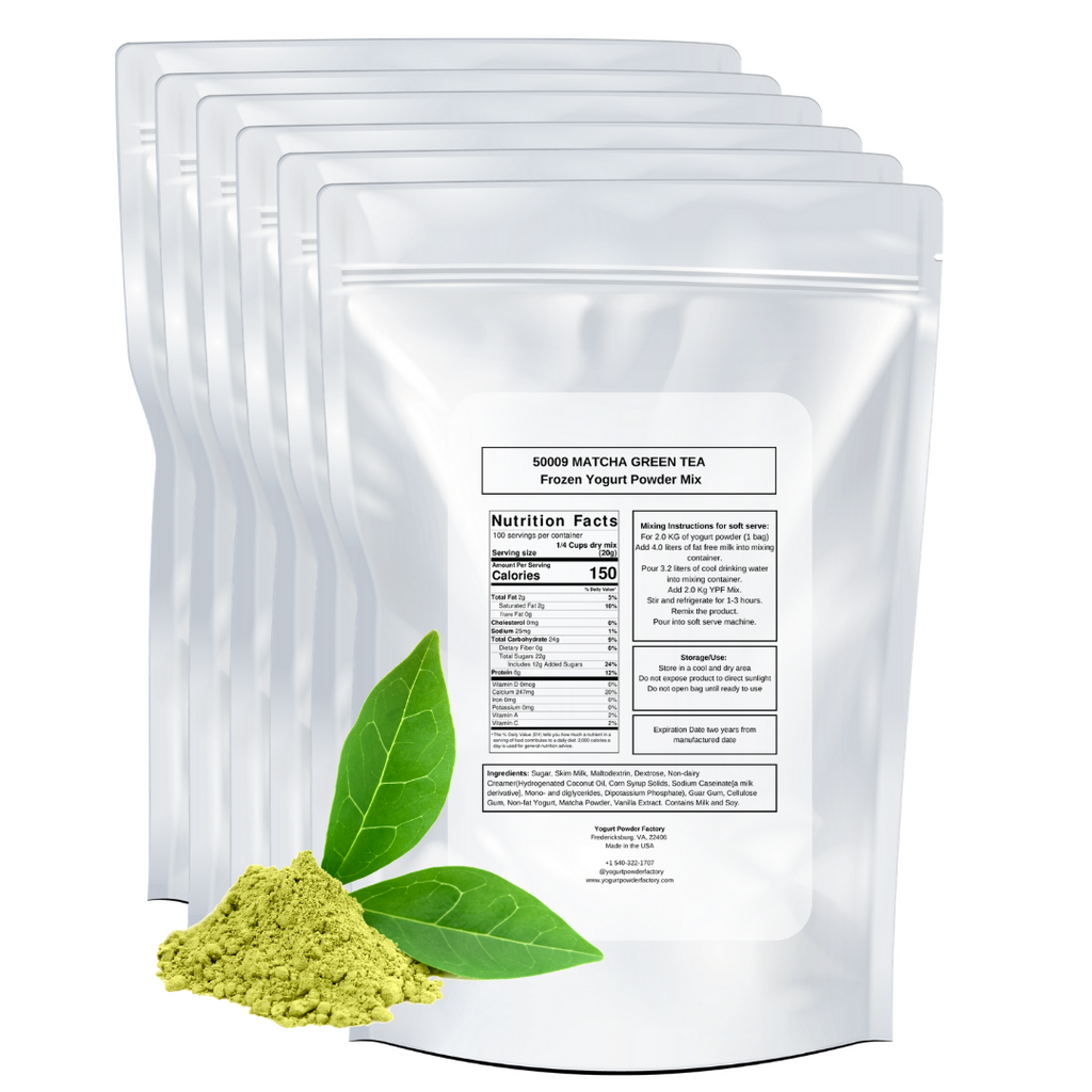 Matcha Green Tea frozen yogurt mix 2kg/4.4lb Bag. Six bags per box. Each bag is 23 x 33 x 10cm/9 x 13 x 4 inches. Yield is over 10 liters/2.64 gallons of final frozen product per bag of powder.