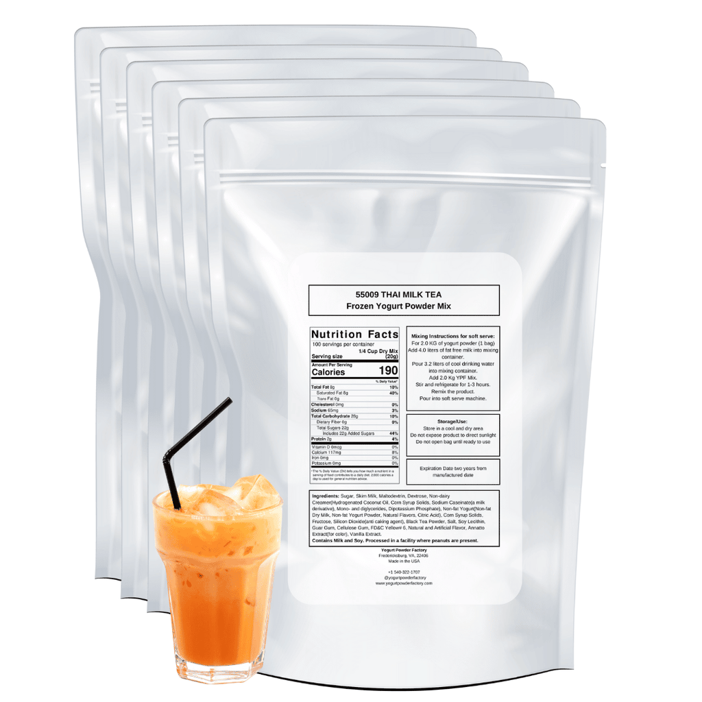 Thai Milk Tea frozen yogurt mix flavor Pre Mix 2kg/4.4lb Bag. Six bags per box. Each bag is 23 x 33 x 10cm/9 x 13 x 4 inches. Yield is over 10 liters/2.64 gallons of final frozen product per bag of powder.